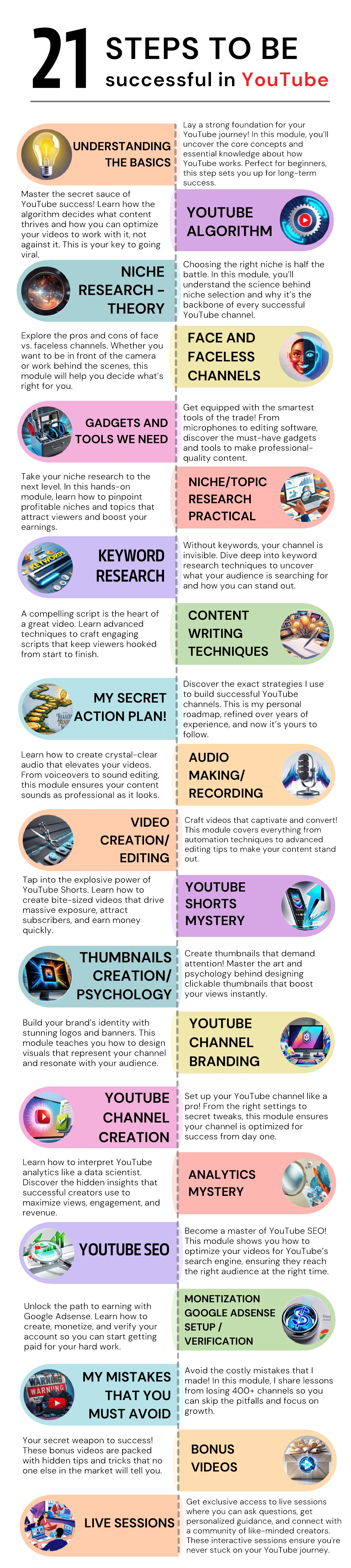 “These modules are your ticket to building a profitable YouTube career. Don’t wait – the only thing standing between you and success is action. Let’s make it happen!”